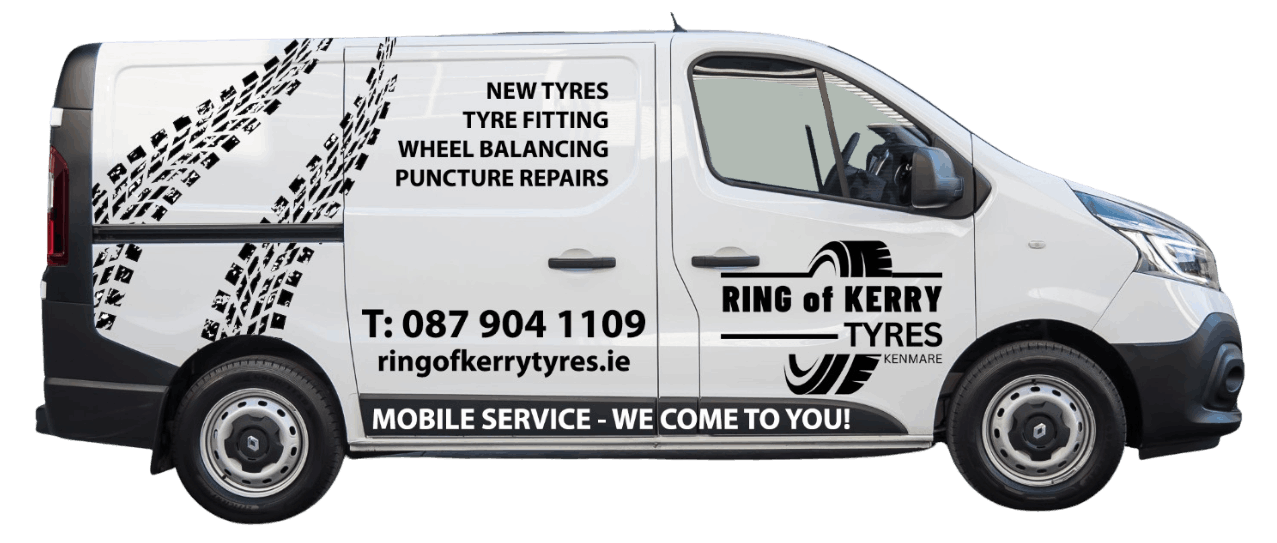 A flat tyre can become an unexpected and sometimes dangerous burden, especially when you are on the road and even more so on a fast moving dual carriageway or motorway.. Our professional 24-hour mobile tyre fitters will come to your rescue 24 hours a day, regardless of where you’re stranded or what you have planned. Our turnover time is exceptionally prompt. We aim to have you back on the road in no time at all. Offering competitive rates, we can beat our competitors on time and price. At Ring of Kerry Tyres, our emergency tyre fitting service is second to none, saving you time, money and any inconvenience you may face with a punctured or flat tyre.